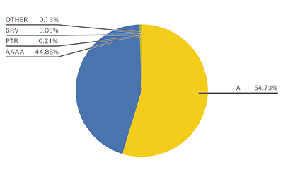 問い合わせレコードタイプに注目すると、ホスト名に対応するIPv4アドレスを問い合わせるAレコードとIPv6アドレスを問い合わせるAAAAレコードがほとんどを占めています。AとAAAAの問い合わせ傾向は通信に利用されるIPプロトコルで違いが見られ、IPv6での問い合わせではより多くのAAAAレコード問い合わせが見られます。IPv4での問い合わせでは、全体の84%程度がAレコード問い合わせ、14%程度がAAAAレコード問い合わせです(図-1)。一方IPv6での問い合わせでは、全体の54%程度がAレコード問い合わせ、44%程度がAAAAレコード問い合わせと、AAAAレコード問い合わせの比率が高まっています(図-2)。昨年と比べると、IPv6はほぼ同様の傾向を示している一方、IPv4では3ポイント程度Aレコードの問い合わせが減り、AAAAレコードの問い合わせが3ポイント程度増加しています。
