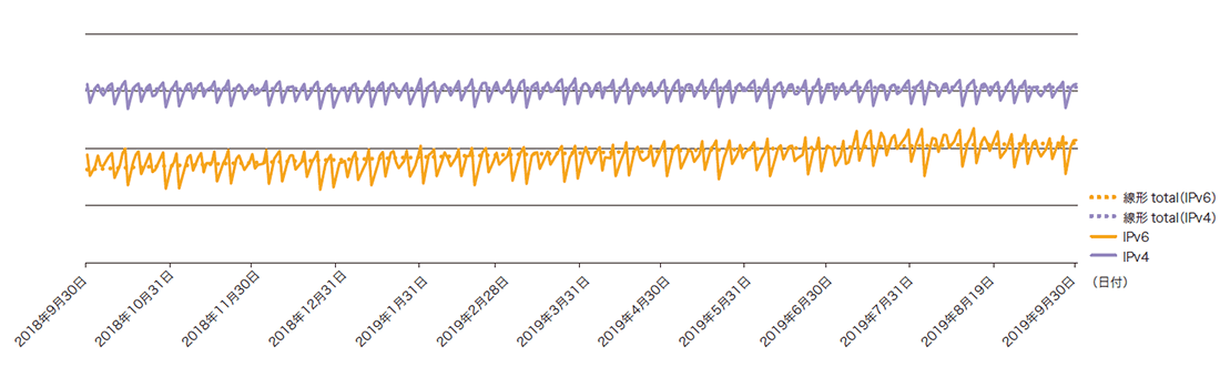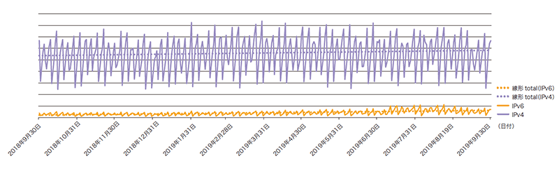 前回同様、IIJのコアPOP(東京・大阪・名古屋)のバックボーンルータで計測した、IPv4トラフィックとIPv6トラフィックを図-3に示します。期間は2018年10月1日から2019年9月30日までの1年間です。