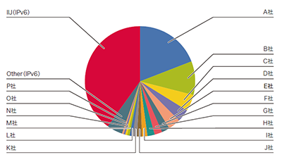 やはり最上位はA社ですが、2位以下とのトラフィック量の差が更に縮小すると共に、占有率も前回比で6割程度に下がりました。これは、多くの事業者でIPv6の活用が進んでいると共に、2019年7月からIIJの関連会社で動画配信プラットフォームの提供を行うJOCDNのプラットフォームを利用している動画配信サービスでIPv6が有効化されたことで、IIJのIPv6トラフィックが増加したためと思われます。
