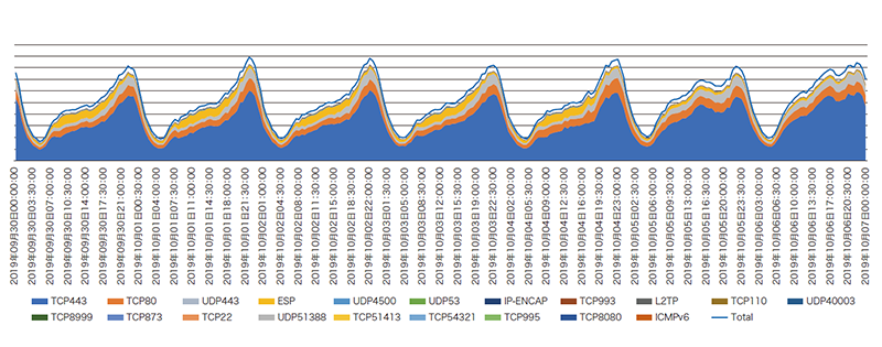 IPv6トラフィックのProtocol番号(Next-Header)と送信元ポート番号で解析したグラフを図-8に、IPv4トラフィックのProtocol番号と送信元ポート番号のグラフを図-9に示します(2019年9月30日からの1週間)。
