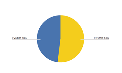 まず、IPv6が有効化されている接続の割合ですが、図-10のとおり、有効48%、無効52%とほぼ半々となっています。接続数はほぼ半々ですが、トラフィックについては、IPv4が約8割、IPv6は2割程度になっています。