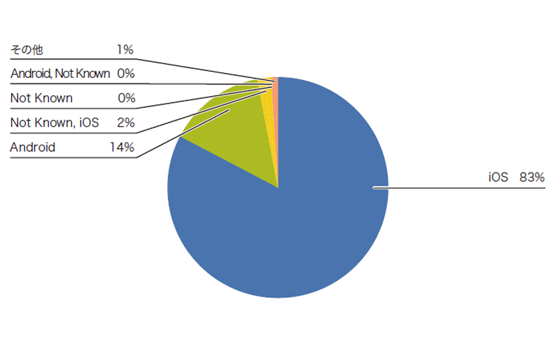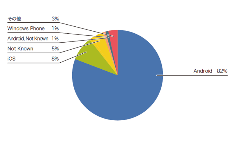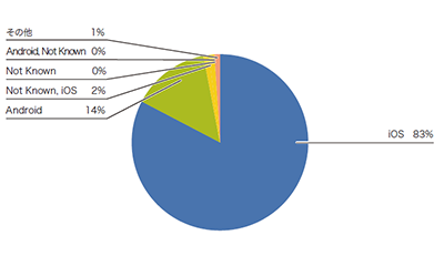 まず、IPv6が有効になっている端末のOSを調べてみます。図-11のとおり、8割以上がApple iOSで、Androidは14%でした。次に、IPv6が無効になっている端末のOSを見てみます。図-12のとおり、先程と逆転し、Androidが82%、iOSが8%でした。