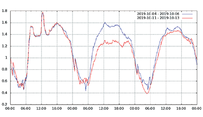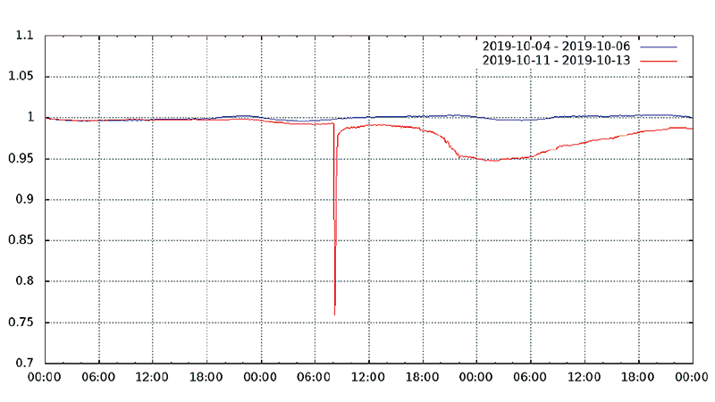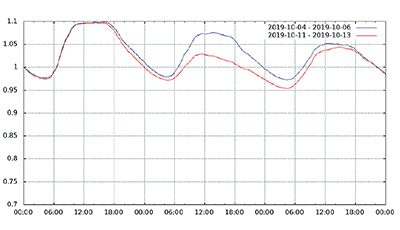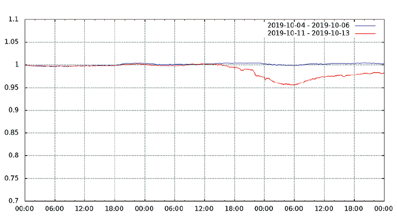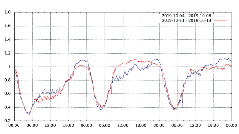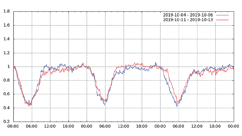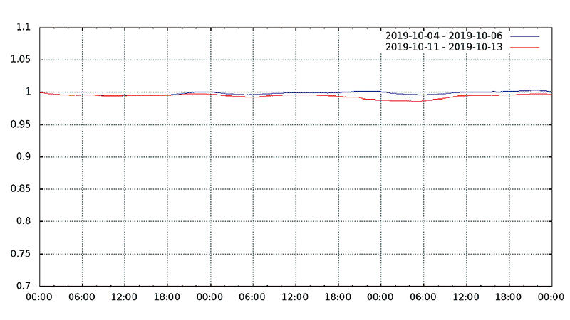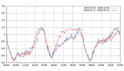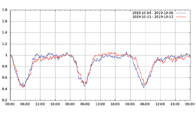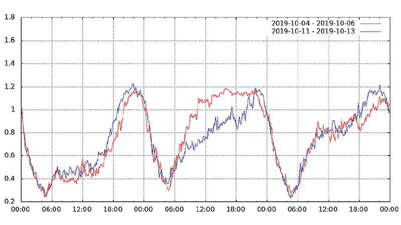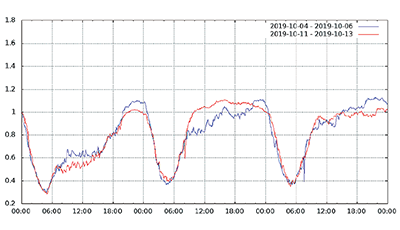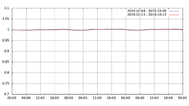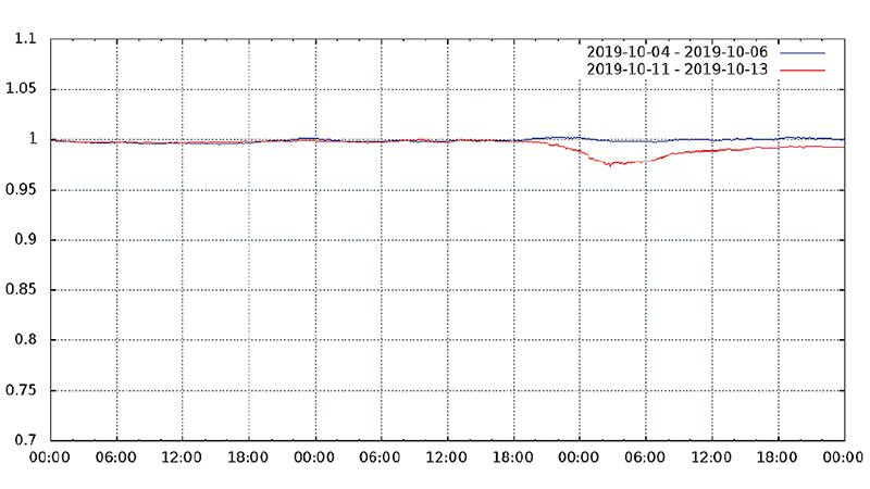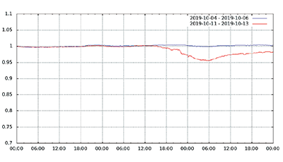 図-13から図-24は、台風19号が本州を通過した2019年10月12日前後及び対比のため1週間前の2019年10月5日前後の接続数とトラフィック量(アップロードとダウンロードの合計)の推移を表したグラフです。いずれも、金曜日(2019年10月4日、2019年10月11日)00:00の値を1として正規化しています。