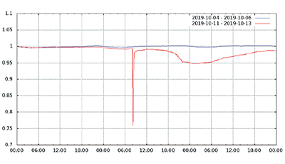 まずは接続数に着目してみます。現在、フレッツの利用者の多くはブロードバンドルータやホームゲートウェイを介した常時接続のため、通常は1日を通じて接続数の変化はほとんどありません。実際、台風19号の影響がほとんどなかったフレッツ大阪エリアでは、期間中の接続数の変化はごくわずかでした。