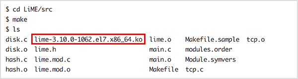 LiMEはLinux Memory Extractorの略でVolatilityがメモリイメージの取得に推奨している(※5)ツールです。LiMEはLinuxのカーネルモジュールとして動作するため、解析対象ホストで動作しているカーネルのバージョンに合わせてLiMEをコンパイルする必要があります。