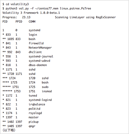 図-27 Linuxメモリイメージに対してpstreeプラグインを実行