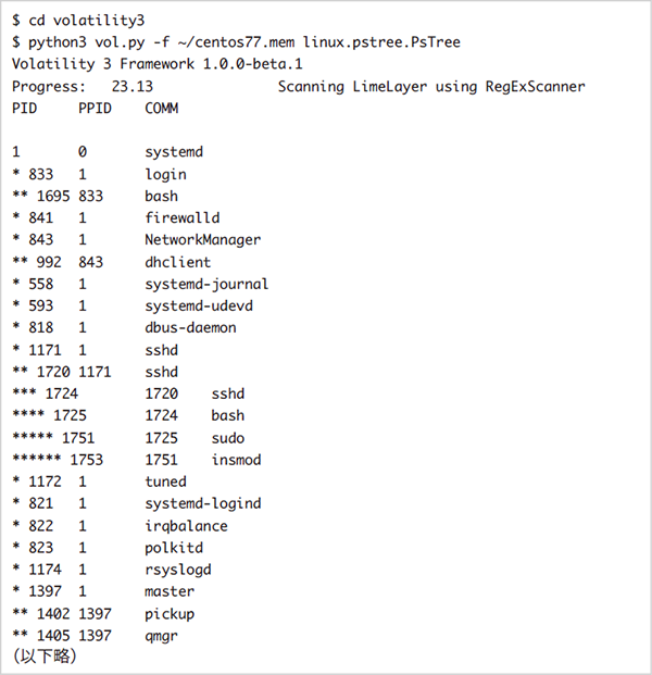 Volatility 3は、「python3 vol.py -f < メモリイメージファイル> <プラグイン>」のような形式のコマンドラインで実行します。図-27はCentOS 7.7のメモリイメージをpstreeプラグインで解析した際の実行結果です。プロセスのネストを表す記号が「*」となっており、Volatility 2から若干フォーマットが変更されています。また、実行するプラグインの指定方法も変更されています。pstreeプラグインの場合、Volatility 2では「linux_pstree」と指定していましたが、Volatility 3では「linux.pstree.PsTree」と指定します。使用できるプラグインの一覧は「python3 vol.py -h」を実行すると分かります。