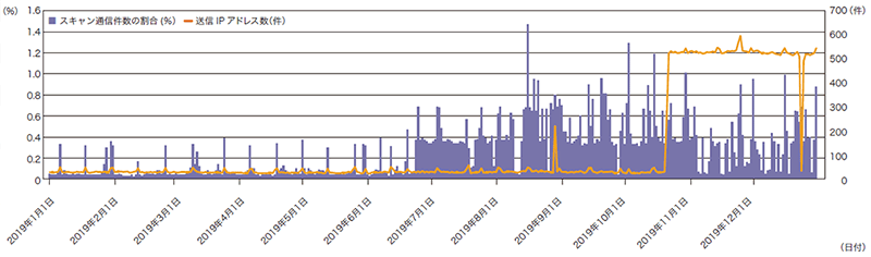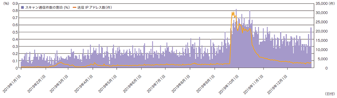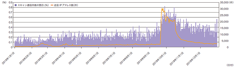 図-3より、6月24日頃から当該ポートへのスキャンが増加していることが確認できます。また、10月22日頃からスキャン活動を実施する送信元IPアドレス数が増加しています。したがって、NetScout Systems, Inc.のレポートが公開される(注15)数日前からスキャン活動が増加していたことが分かります。