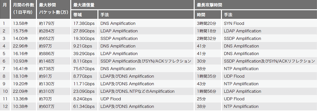 DDoS攻撃の発生件数は月単位で1日あたりの平均を算出していますが、2019年にはDDoS攻撃が顕著に活発な月はありませんでした。1秒あたりのパケット数が最も大きかったのは5月で、最も長い攻撃は1月に発生していました。また、最大パケット数が比較的大きかったのは5月、7月、12月でしたが、攻撃の最長時間は1時間未満に収まっていました。毎月の最大通信量及び最大攻撃時間で利用された攻撃種別の多くはLDAPやDNSを用いたUDP Amplificationが目立っています。