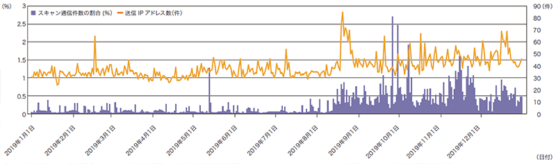 2つ目のARMSは、Apple Remote Desktop(ARD)で利用されているサービスで、ARDはMacOSの複数端末をリモートから制御するためのアプリケーションです。ARMSは3283/UDPを通して、管理コンソールからのコマンドなどの命令を受信します。このARMSをインターネット上に公開している端末は、約4万台存在していたことが確認されています(注14)。図-3では、2019年にSOCで観測した当該ポートへのスキャン活動の推移を示します。なお、通信件数の値は年間に観測した3283/UDP宛てスキャン通信の合計を100%として正規化した当該通信の割合を記載しています。