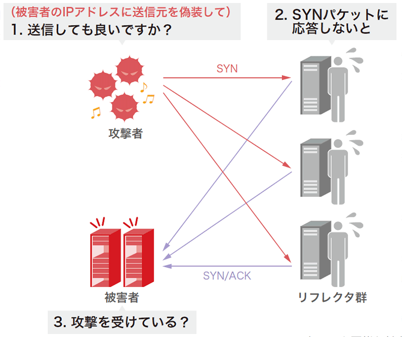 SYN/ACKリフレクション攻撃の発生から、被害者に被害が発生するまでの流れを以下に説明します。図-4と併せてご覧ください。