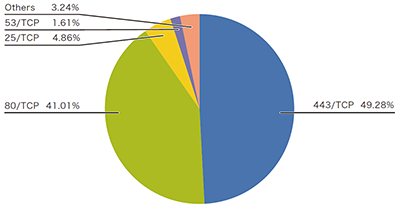 SYN/ACKリフレクション攻撃が日本国内の企業に向けたDDoS攻撃で利用された事例として、表-2の6月の最大通信量・最長攻撃時間を記録した攻撃が挙げられます。SYN/ACKリフレクション攻撃の大きな特徴は、リフレクタとして任意のTCPポートが利用されるため、WSDやARMSのように特定のポートに紐づくサービスを悪用するものではありません。そのため、Webサーバで一般的に利用される80/TCPや443/TCPなどが利用されます。例えば、インターネット上に公開しているWebサーバ上のコンテンツは、幅広く閲覧してもらうために何処からでもアクセスできることが重要になります。この場合、ファイアウォールは意図して誰でもアクセスできる設定になっているはずです。この前提の上で、SYN/ACKリフレクション攻撃のリフレクタとして利用された場合、リフレクタ側では容易にアクセス拒否することが難しいと考えられます。 図-5に、2019年にSOCで観測したSYN/ACKリフレクション攻撃のリフレクタとして利用されたTCPポートの割合を示します。