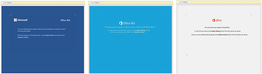 Emotetへの感染を誘導するdocファイルを開くと、Wordの初期設定状態では図-6に示すような「コンテンツの有効化」を促すメッセージが表示されます。そして「コンテンツの有効化」を許可することによりマクロが実行されます。なお、Wordの設定でマクロを有効化している場合には、図-6のような画面は表示されず、マクロは自動で実行されます。そして、マクロが実行されるとマルウェア配布サーバよりEmotetがダウンロードされ、感染へと繋がります。