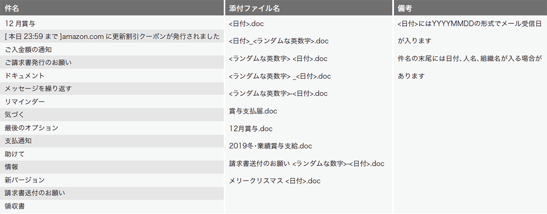 表-3に示したようにメールの件名には、「気づく」・「助けて」・「情報」など1単語だけの表現や請求書・領収書を装ったものなど様々なバリエーションがあります。また、ブラックフライデーのシーズンにはECサイトの割引クーポンを装った件名や、年末には件名もしくは添付ファイル名に「賞与」・「クリスマス」といった時期に合わせた単語が用いられるようになりました。