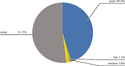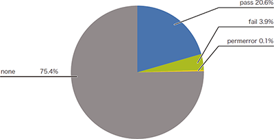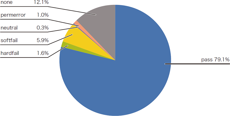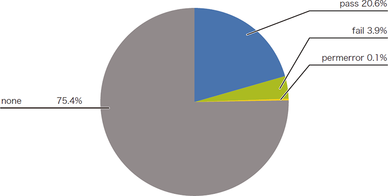 送信ドメイン認証技術の普及率を調査する観点として、実用上の効果を考えれば、メール受信時の認証結果の割合が重要であると考えることができます。IIJが提供するメールサービスでは、メール受信時にSPF、DKIM、DMARCの送信ドメイン認証機能を提供しています。受信メールのうち、それぞれで認証ができなかった場合の結果はnoneとなります。つまり、受信メールに対しての認証結果noneを除いた割合が受信メールに対する普及率の割合と言えます。