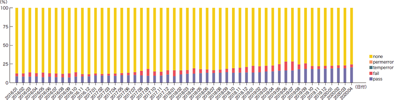 図-4に2016年1月からのDMARCの認証結果の割合の推移を示します。このグラフからも、2020年4月が時期的に極端に低かったということではなく、少しずつDMARCに対応した送信ドメインは増えてきているものの、その伸びが非常に緩やかであったことが分かります。