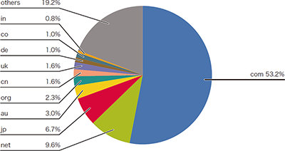 図-5に、DMARCがpassしたドメイン名のTLD(Top Level Domain)の割合を示します。これは、受信したメール量に対する割合ではなく、DMARCドメイン名別(ユニークなドメイン名)のTLDの数の割合です。最も割合が高いTLDは.comで53.2%でした。続いて2番目に割合が高いのが.netで9.5%、日本の.jpドメイン名が3番目で6.7%でした。SPFがpassしたドメイン名のTLDでも.comが最も多いTLDでしたので、順位的には大きな違いはありませんでした。