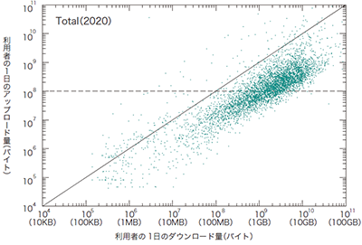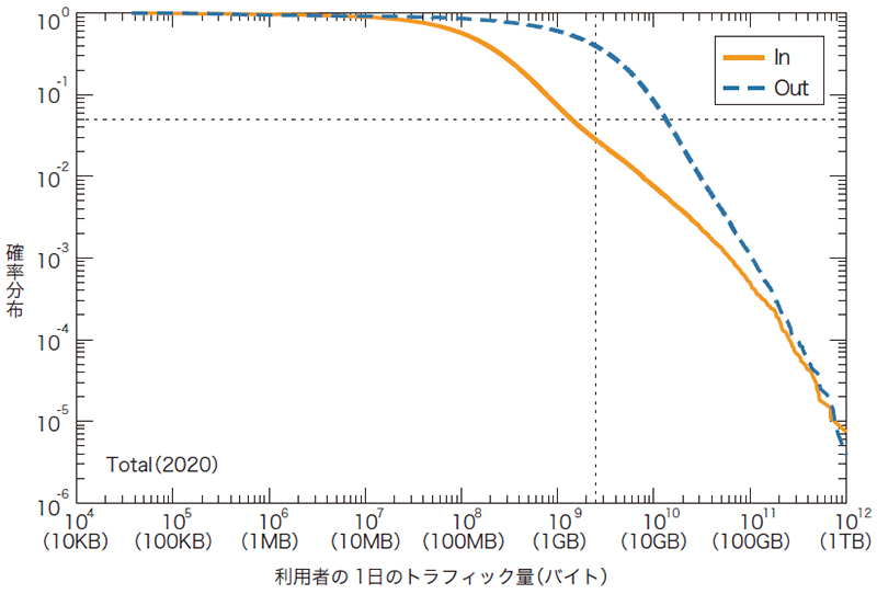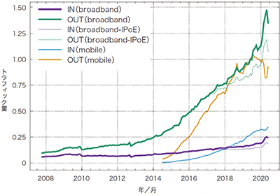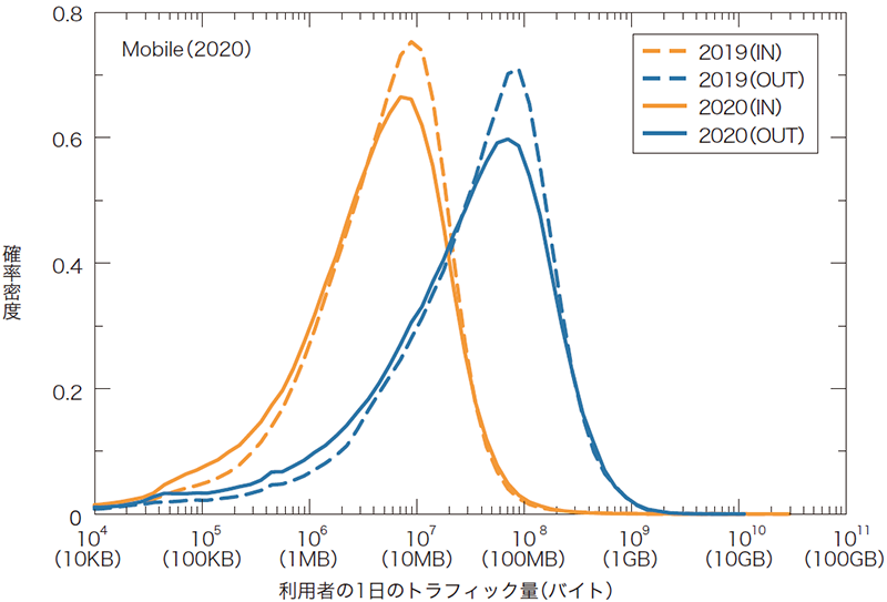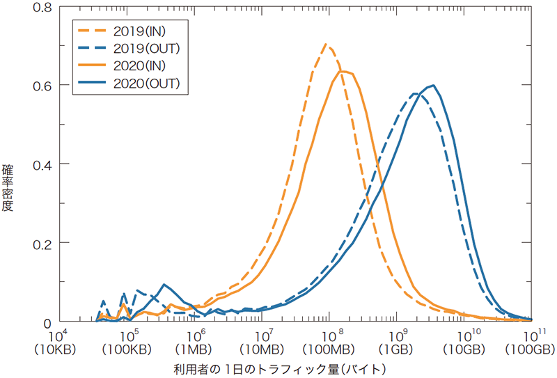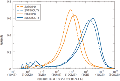 OUTの分布はINの分布より右にずれていて、ダウンロード量がアップロード量より、ひと桁以上大きくなっています。2019年と2020年で比較すると、INとOUT共に分布の山が右に移動しており、利用者全体のトラフィック量が増えていることが分かります。今回は前回に比べてこの増加量が大きくなっています。