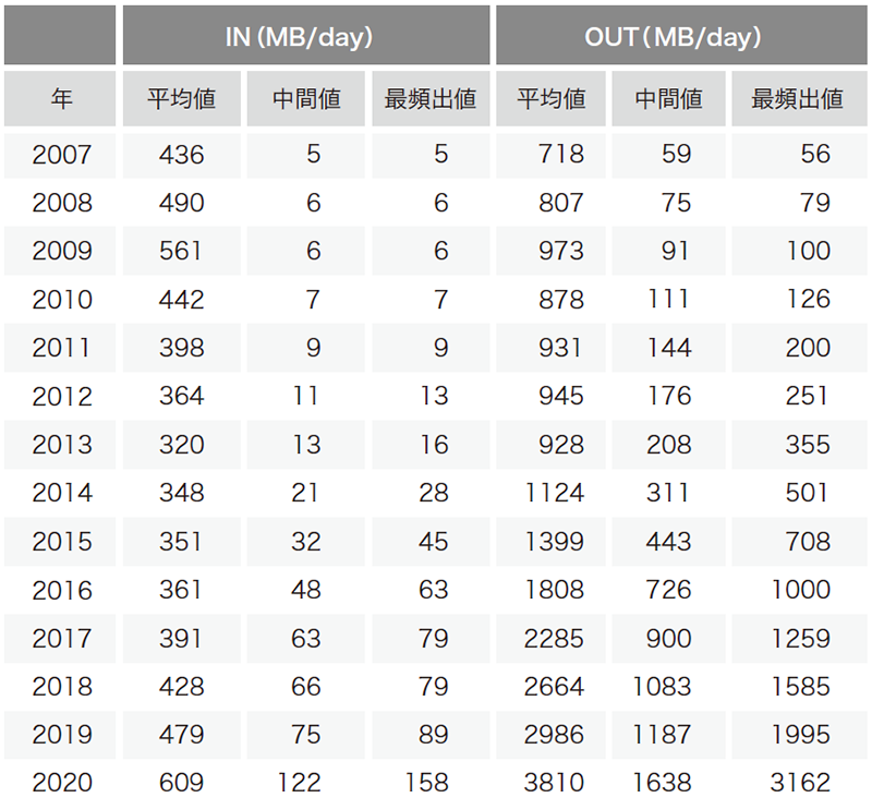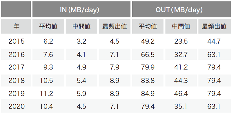 モバイルでは、ヘビーユーザが少ないため、平均と最頻出値が近い値になります。表-2に示すように、今回はすべての項目で減少しています。2020年の最頻出値は、INで7MB、OUT で63MBで、平均値は、INで10MB、OUTで79MBです。2019 年の最頻出値は、INで9MB、OUTで79MB、平均値は、INで11MB、OUTで85MBでした。