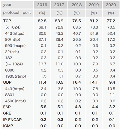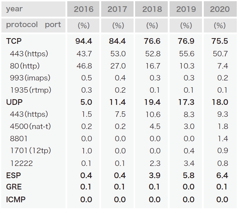 表-3はブロードバンド利用者のポート使用割合の過去5年間の推移を示します。2020年の全体トラフィックの77%はTCP です。HTTPSのTCP443番ポートの割合は、52%で前回とほぼ同じです。HTTPのTCP80番ポートの割合は20%から17%に減っています。QUICプロトコルで使われるUDP443番ポートは、8%から11%に増えていて、HTTPの減った分とQUICの増えた分がほぼ同じです。