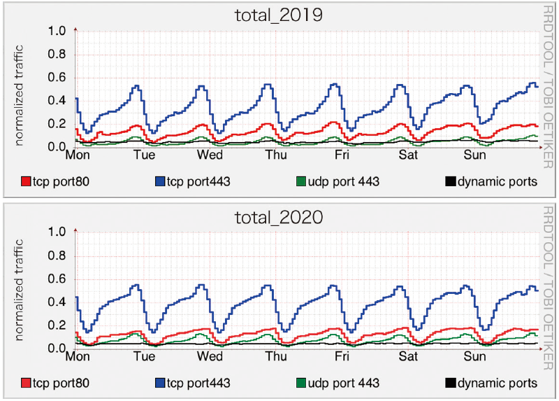 図-8は、ブロードバンド全体トラフィックにおける主要ポート利用の週間推移を、2019年と2020年で比較したものです。TCPポートの80番、443番、1024番以上の動的ポート、UDP ポート443番の4つに分けてそれぞれの推移を示しています。グラフでは、ピーク時の総トラフィック量を1として正規化して表しています。2019年と比較すると、コロナ禍での在宅時間の増加に伴い、平日昼間のトラフィックが大きく増えているのが分かります。全体のピークは19時から23時頃です。