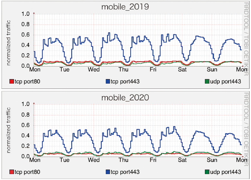図-9のモバイルでは、トラフィックの大半を占めるTCP80番ポートと443番ポート、UDP443番ポートについて推移を示します。2019年と比較すると、モバイルはほとんど変化がありません。ブロードバンドに比べると、朝から夜中までトラフィックの高い状態が続きます。平日には、朝の通勤時間、昼休み、夕方17時頃から22時頃にかけての3つのピークがあり、ブロードバンドとは利用時間の違いがあることが分かります。