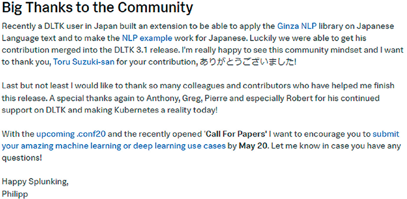 図-4 寄贈先Splunk Deep Learning Toolkit開発者メッセージ(注4)