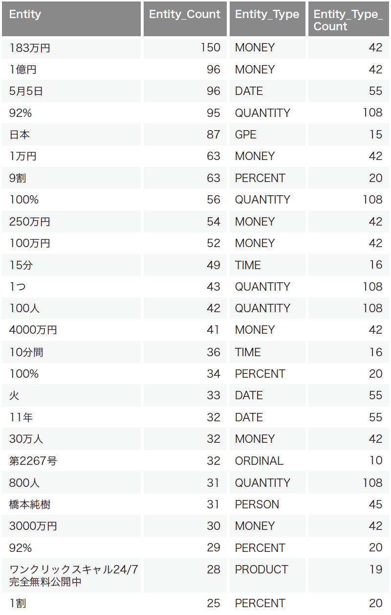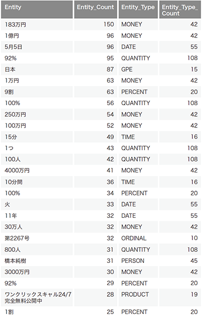 表-1は定点で受信した2020年5月1日の1日分のスパム検体の本文データを独自拡張した固有表現抽出アルゴリズムで分析した結果になります。モデルはja_core_news_md (詳細はhttps://spacy.io/models/jaを参照)を使用しています。Entityが固有表現、Entity_Countがその固有表現の出現数、Entity_Typeが使用したモデルの中で定義されている属性分類、Entity_Type_Countがその属性分類の出現数を示しています。