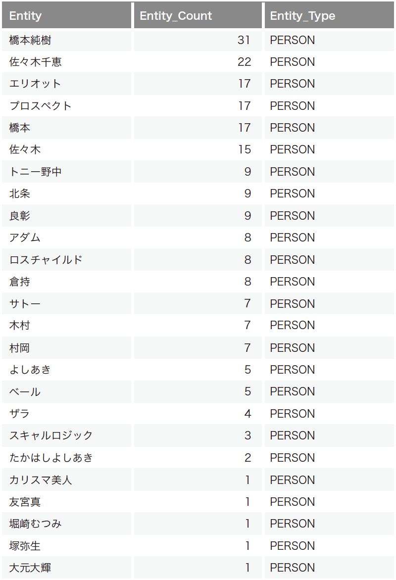 表-2は同一の日のスパムを分析し、人名の属性を示すPERSON で絞り込んだ結果の抜粋です。人名が姓と名に分解されずに抽出されており、人名を解析軸として分析する場合に大きなメリットになります。大量のテキストデータを固有表現抽出により人名やプロダクト名で分類することができるため、稼働状況の分析やナレッジのデータベース化などに活用できそうです。