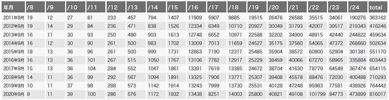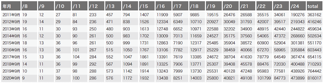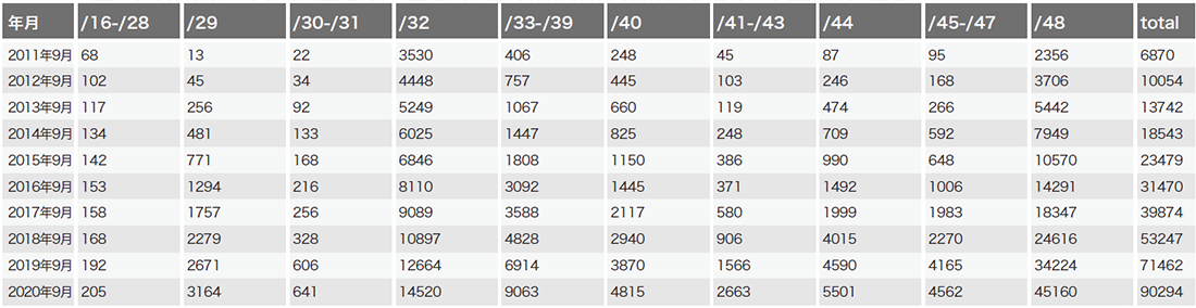 最初に、IIJ網から他組織に広報している「IPv4フルルート」の情報(表-1)及び「IPv4フルルート」に含まれるunique IPv4アドレス数の情報(表-2)を確認します。なおこの1年の間にRIPE NCC及びLACNICのIPv4アドレス在庫が完全枯渇を迎えています。残るはAPNICとAfriNICですが、APNICは既に2021年初めの完全枯渇予測が出ており、またAfriNICでは2020年1月から割り振り/割り当てサイズに上限(/22)が設けられています。