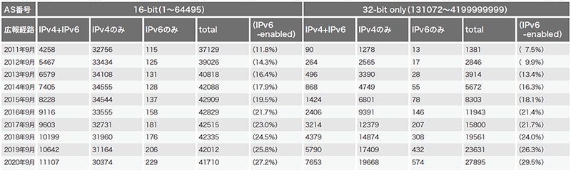 最後に「IPv4/IPv6フルルート」広報元AS(Origin AS)数を確認します(表-4)。なおこの1年の間に、RIPE NCCに3072、LACNICに2048の32-bit only AS番号が追加割り振りされています。