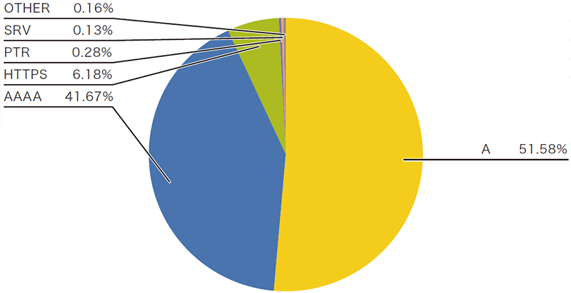 問い合わせレコードタイプに注目すると、ホスト名に対応するIPv4アドレスを問い合わせるAレコードとIPv6アドレスを問い合わせるAAAAレコードがほとんどを占めています。AとAAAAの問い合わせ傾向は通信に利用されるIPプロトコルで違いが見られ、IPv6での問い合わせではより多くのAAAAレコード問い合わせが見られます。IPv4での問い合わせでは、全体の79%程度がAレコード問い合わせ、15%程度がAAAAレコード問い合わせです(図-1)。一方IPv6での問い合わせでは、全体の51%程度がAレコード問い合わせ、41%程度がAAAAレコード問い合わせとAAAAレコード問い合わせの比率が高まっています(図-2)。昨年と比べるとIPv4で5ポイント、IPv6で3ポイント程度Aレコードの問い合わせが減っています。今年は新しく実装されたばかりのHTTPSタイプのDNS問い合わせがIPv4で2%、IPv6で6%程度を占め、AとAAAAに次ぐ問い合わせ量になっています。この問い合わせは現状でApple社のiOS 14などがサポートしているようで、今後実装が広がるに連れて徐々に増加すると予想しています。