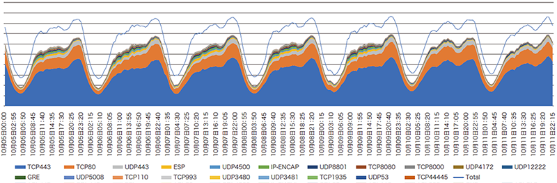 IPv6トラフィックのProtocol番号(Next-Header)と送信元ポート番号で解析したグラフを図-8に、IPv4トラフィックのProtocol番号と送信元ポート番号のグラフを図-9に示します。期間は2020年10月5日(月)から1週間です。