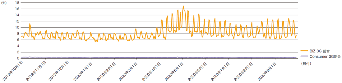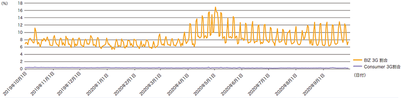 今回はIIJで提供しているモバイルサービスにおける3Gトラフィックの傾向について解説します。対象期間は2019年10月1日から2020年9月30日です。