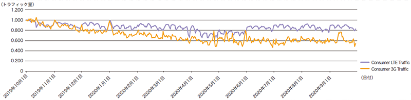 コンシューマ向けサービスのLTEのトラフィック量については、セッション数ではほぼ横ばい状態でしたが、トラフィック量に関しては2020年3月から5月にかけて一時的に3割減という状態になりました。こちらはコロナ禍での自粛期間中の落ち込みと考えられます。
