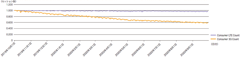 次に、2019年10月1日を基準日としたときのコンシューマ向けサービスのトラフィック量(図-11)とセッション数(図-12)に関する傾向をグラフに示します。コンシューマ向けサービスの3Gトラフィックに関してはトラフィック量、セッション数共に右肩下がりとなっており、ここ1年間でトラフィック、セッション数共に40%程度減っています。要因はいろいろと考えることができますが、コンシューマサービスの接続端末はほぼスマートフォンであることを考えると、世間でのLTEの接続環境が向上しており、3Gに落ちることが少なくなっていることが考えられます。今後どのような推移を見せていくかは確認していきます。