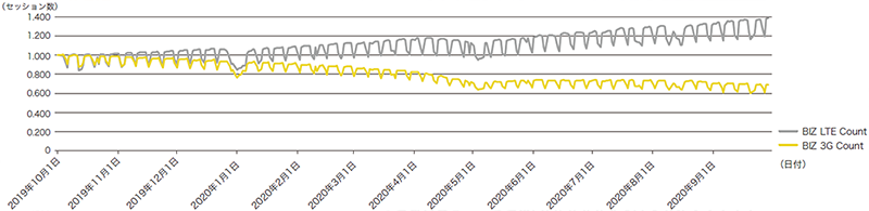 また、LTEのトラフィック傾向ですが、セッション数では3Gと同様に自粛期間中の落ち込みはあるものの、断続的な増加傾向にあります。またトラフィック量に関しても自粛期間である2020年4月〜5月を底として、いまは徐々に戻ってきている状況にあります。