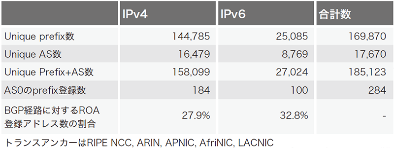今回は、IIJでBGP ROVを適用する前の2020年10月の特定の日における情報を抽出しています。表-5は、2020年10月のIIJのROAキャッシュサーバから特定の日のVRP(Validated ROA Payloads)をエクスポートしたデータから作成しています。ROAには、自組織が広告するprefixと、自組織を示すoriginとなるAS、そして該当のprefixを最大どこまでのprefix長で受け入れるのかを示すmax lengthがセットで登録されています。BGP経路に対するROA登録アドレス数の割合は、IIJの特定の日時のBGP経路数のUniqueアドレス数に対するROAの登録prefixの割合を示しています。