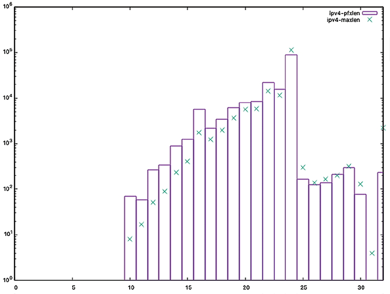次に、ROAに登録されているprefix長とmax lengthの分布を図-16、図-17に示します。