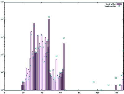IPv6の1位はTCP443(HTTPS)、2位はUDP443(QUIC)となっており、HTTP系暗号化プロトコルで8割を超えるほどです。今回特徴的なのはTCP80(暗号化なしHTTP)が4位に落ち、ESP(IPSec暗号化)が3位に入ってきていることでしょうか。ESPは平日日中帯により多く観測されており、土日は少ないことから、企業ネットワークにおいて、IPv6 VPNの利用が増加しているものと思われます。平日昼の最も多い時間帯に全体の19%程を占めており、日中はQUICを逆転する程です。なお、グラフで見て取れるのは5位までであり、6位以下は量が少なく、グラフで確認することが困難なほどの量しかありません。