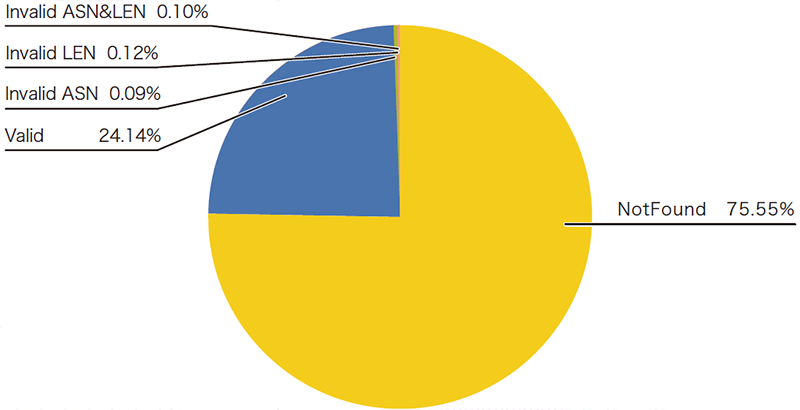 Validとして判定されるのは、IPv4では24%、IPv6では29%程度であり、Invalidとして判定されるものは、IPv4では0.32%, IPv6では0.49%程度となりました。ROAに合致するprefixがないものはNotFoundとして示されており、全体の7割がそれにあたります。今後ROAの登録がすすむにつれて、NotFoundの割合は少なくなっていくと期待しています。また、Invalidな経路であっても、より大きい空間がValidやNotFoundとして判定されるケースがあるため、Invalidな経路として判定されたとしても、必ずしも到達性がなくなるわけではありませんが、そうでない経路も存在しており、IPv4の0.028%、IPv6の0.02%程度がそれにあたります。