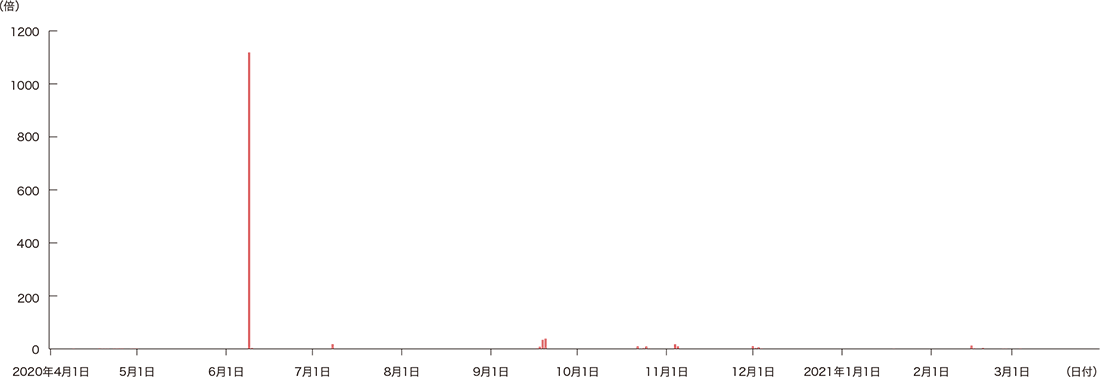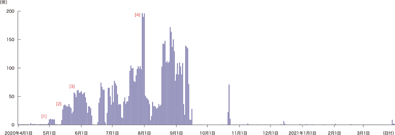 2020年度上半期は、これまでに類を見ない量の迷惑メールを断続的に観測しました。縦軸を最大値に合わせているため確認しづらくなっていますが、4月の平均を1としたとき、5月上旬の第1波で約10倍[1]、5月中旬の第2波で約40倍[2]、5月下旬から6月の上旬で約60倍[3]規模の迷惑メールを集中的に受信しました。この状況が断続的に続き、7月末には約200倍[4]もの迷惑メールを受信しています。一般的な組織の設備設計で平常時の200倍の規模に耐えられる設備投資をすることは稀だと思いますので、DDoS攻撃と言っても過言ではないでしょう。