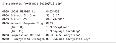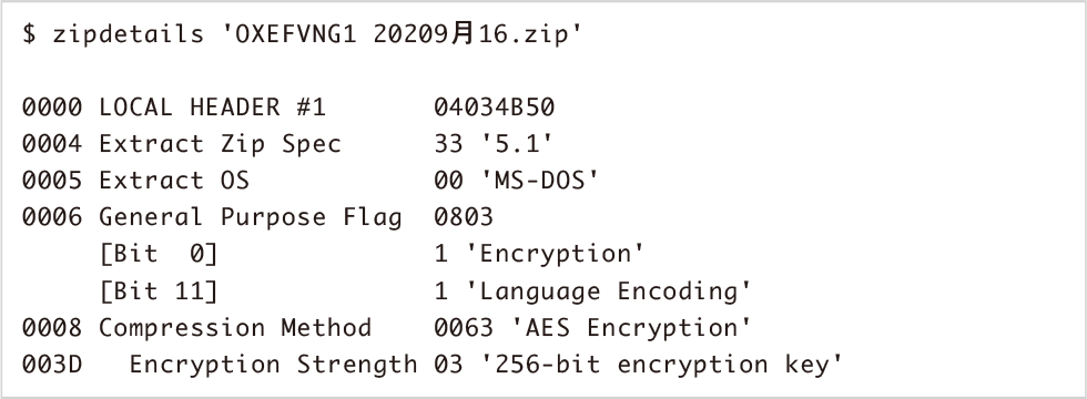 と呼ばれるものでした。2020年に猛威をふるったEmotetは、自分自身をパスワード付きZIPファイルで暗号化するという特徴がありましたが、9月のものは、従来にない特徴がありました。図-4の出力は、受信したEmotet(ZIPファイル形式で暗号化されたもの)の構造を詳細に表示したサンプルの一部です。暗号化方式がZIPファイル標準のZipCryptoから、AES 256-bitに変化していました。