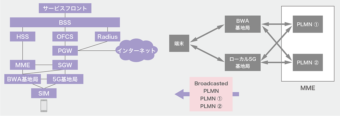 NSA化で必要となる装置は、HSS/MME/S-GW/P-GW/4Gアンカー(BWA)基地局/ローカル5G基地局です。IIJはフルMVNO化により、既にHSSを自前で保有しています。そのため、HSSに対して、NSA化に必要な開発を実施しました。また、BWAのみ契約したユーザに5Gを使用させないために、HSSに図-1の機能を開発しました。