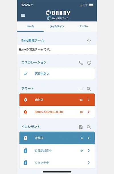 これらの準備ができた状態でサービスの監視アラートが発生すると情報はBarryに送信されます。Barryはアラートを受け取ると、内容を保存し運用チームを特定してエスカレーションを開始します。エスカレーションでは運用チームごとに定義された呼び出しルールに従い、対応可能な担当者が見つかるまでスマートフォンを鳴動させます。