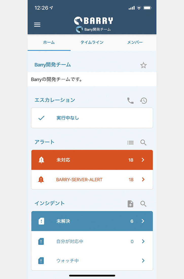 Barryの機能はサーバ、Webフロントエンド、モバイルアプリの3つに分かれています。サーバはエスカレーションやインシデントの管理など中心的な機能を実装しgRPC APIとして提供します。WebフロントエンドとモバイルアプリはサーバのAPIを使用して利用者にUIを提供します(図-1、図-2)。現状では障害対応すべてをモバイルアプリのみで行うのは難しいため、それぞれ得意とする分野を分けています。モバイルアプリでは呼び出しと簡単なコミュニケーションの実現を中心に考えており、本格的な障害対応にはPCからWebフロントエンドを利用する想定でシステムを構成しています。