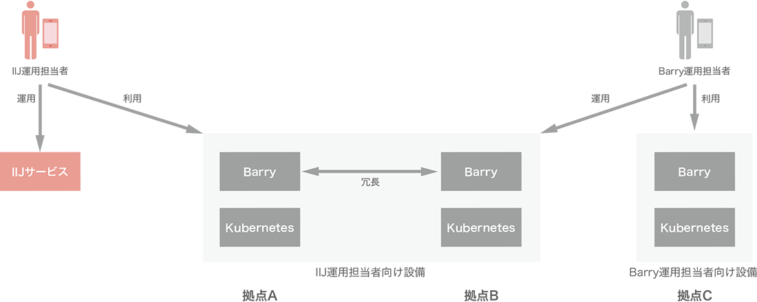 それぞれの拠点では独立したKubernetesクラスタが稼働しており、BarryはKubernetes上で動作しています。Kubernetesの機能を活用する構成により、Barryの運用はハードウェアなどの故障を意識する必要がなくなりました。