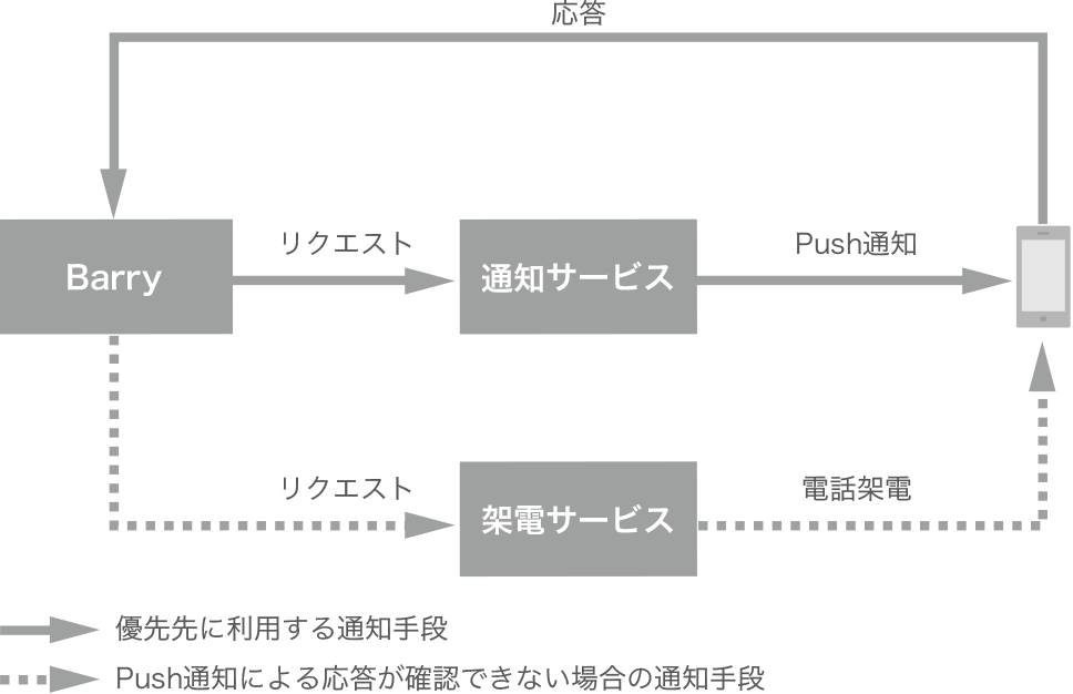 Barryはスマートスマートフォンへの通知に外部サービスを利用しています。外部サービスの障害や遅延が単一障害点とならないよう、複数の外部サービスを組み合わせて実装しています(図-7)。サーバで通知を送信したスマートフォンの反応を確認し、通知の仕組みに異常を検知した場合は自動架電へフォールバックするようにしました。