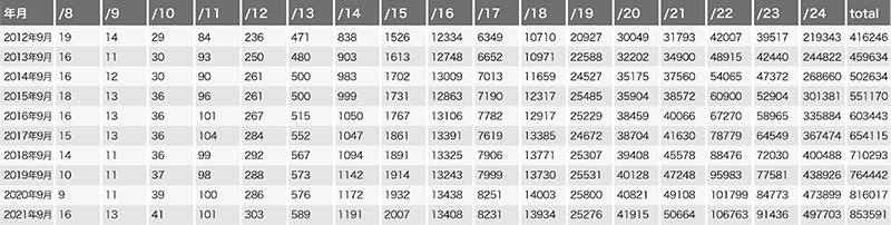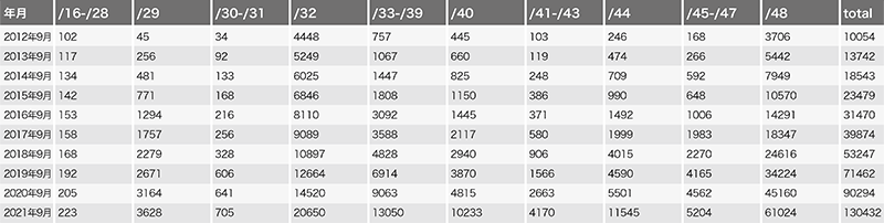 表-2 「IPv6フルルート」に含まれるプレフィクス長ごとの経路数の推移