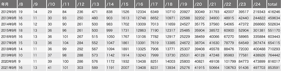 最初に、IIJ網から他組織に広報している「IPv4フルルート」の情報(表-1)及び「IPv4フルルート」に含まれるunique IPv4アドレス数の情報(表-3)を確認します。ちなみに「2021年初め」と予測されていたAPNICのIPv4アドレス在庫完全枯渇はこの1年の間には発生しませんでした。